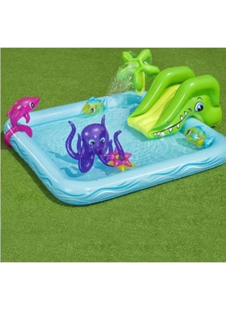 مسبح أطفال نفخ كبير 239×206×86 سم │ حوض سباحة متنقّل مع زحليقة تمساح وألعاب أخطبوط ورشّاش مائي